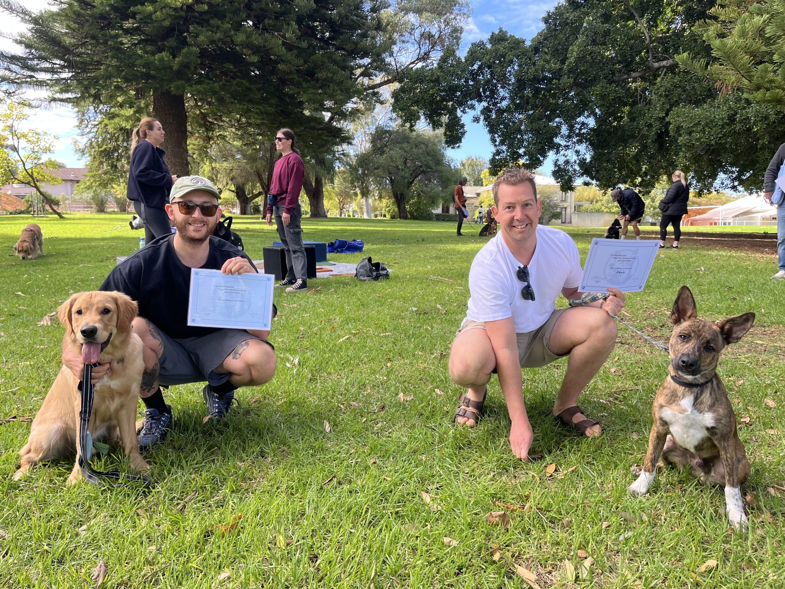 Two women with their dogs holding certificates in a park, showcasing Agile Dogs' professional training services.