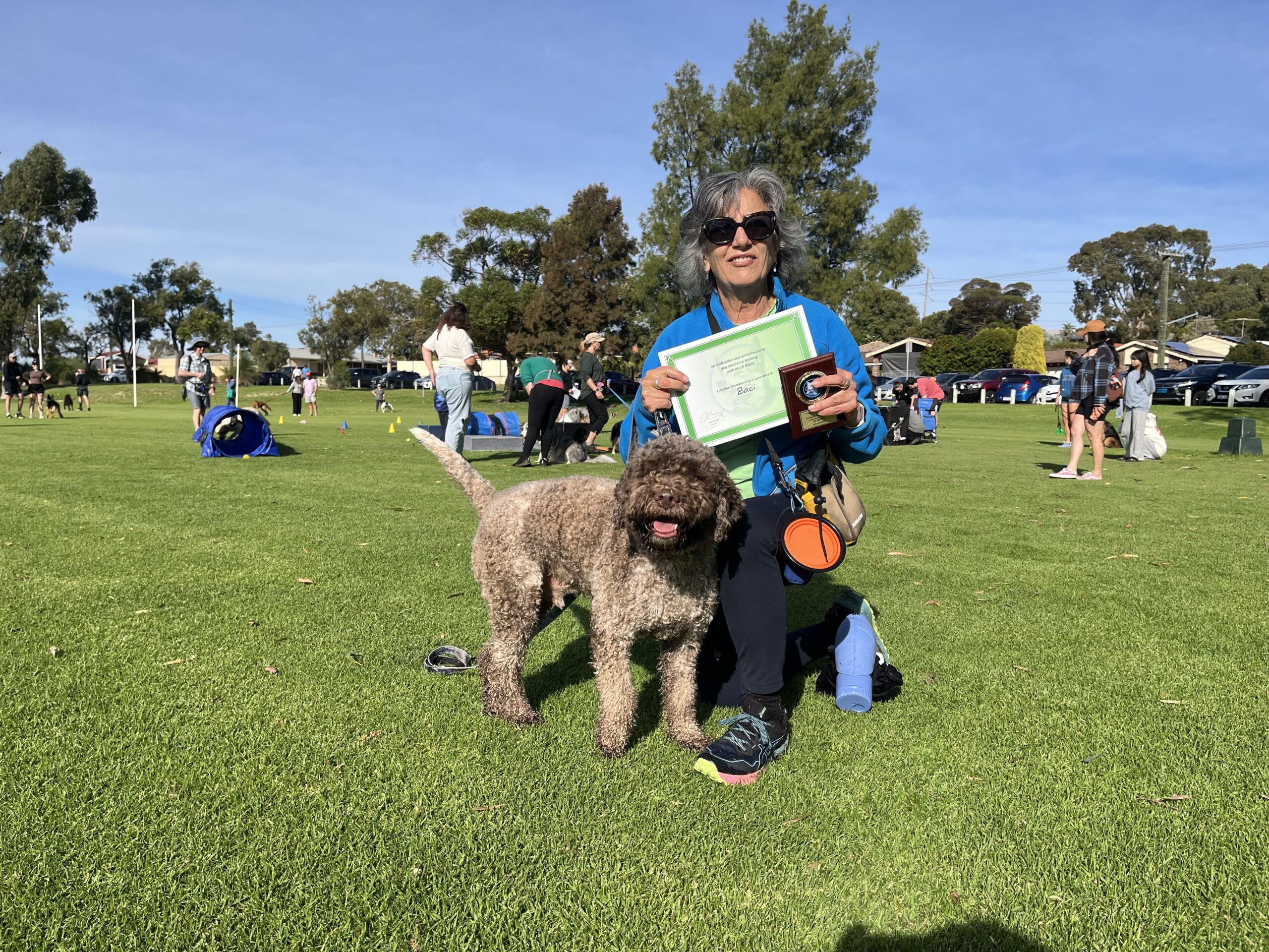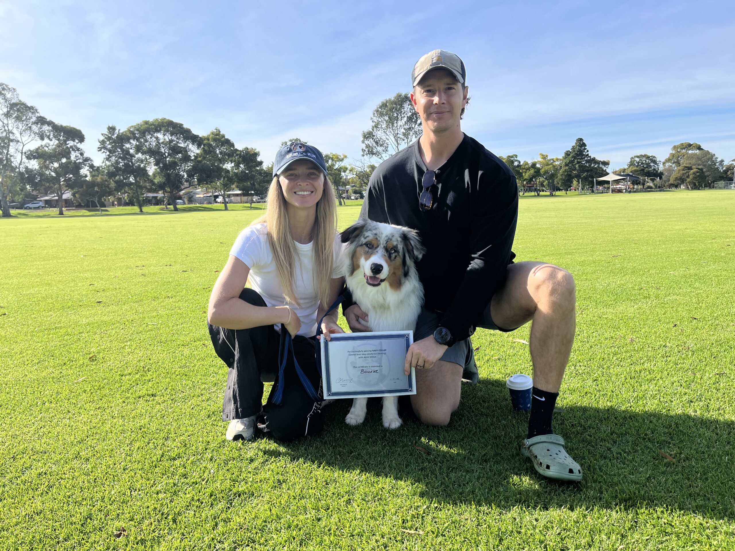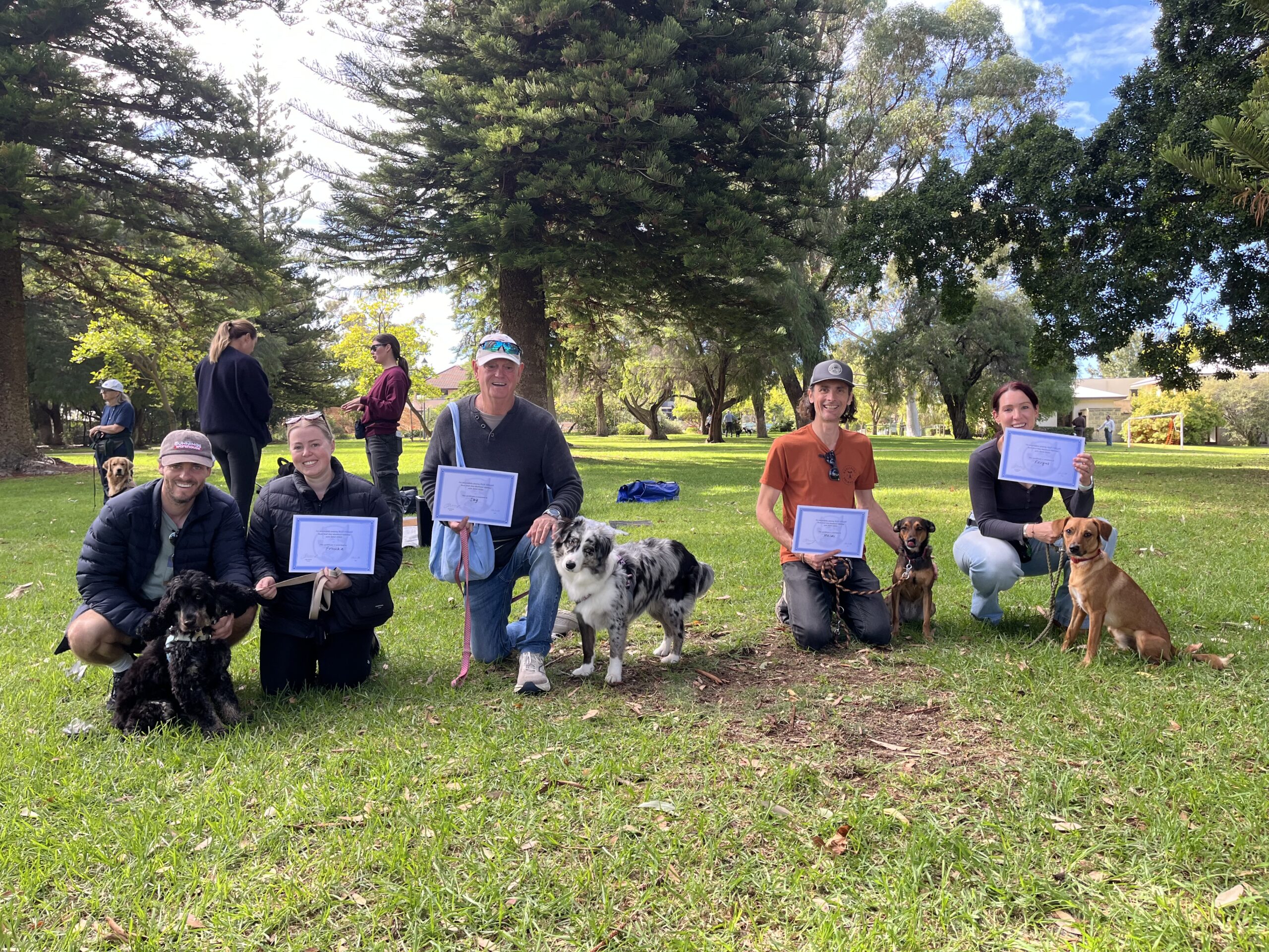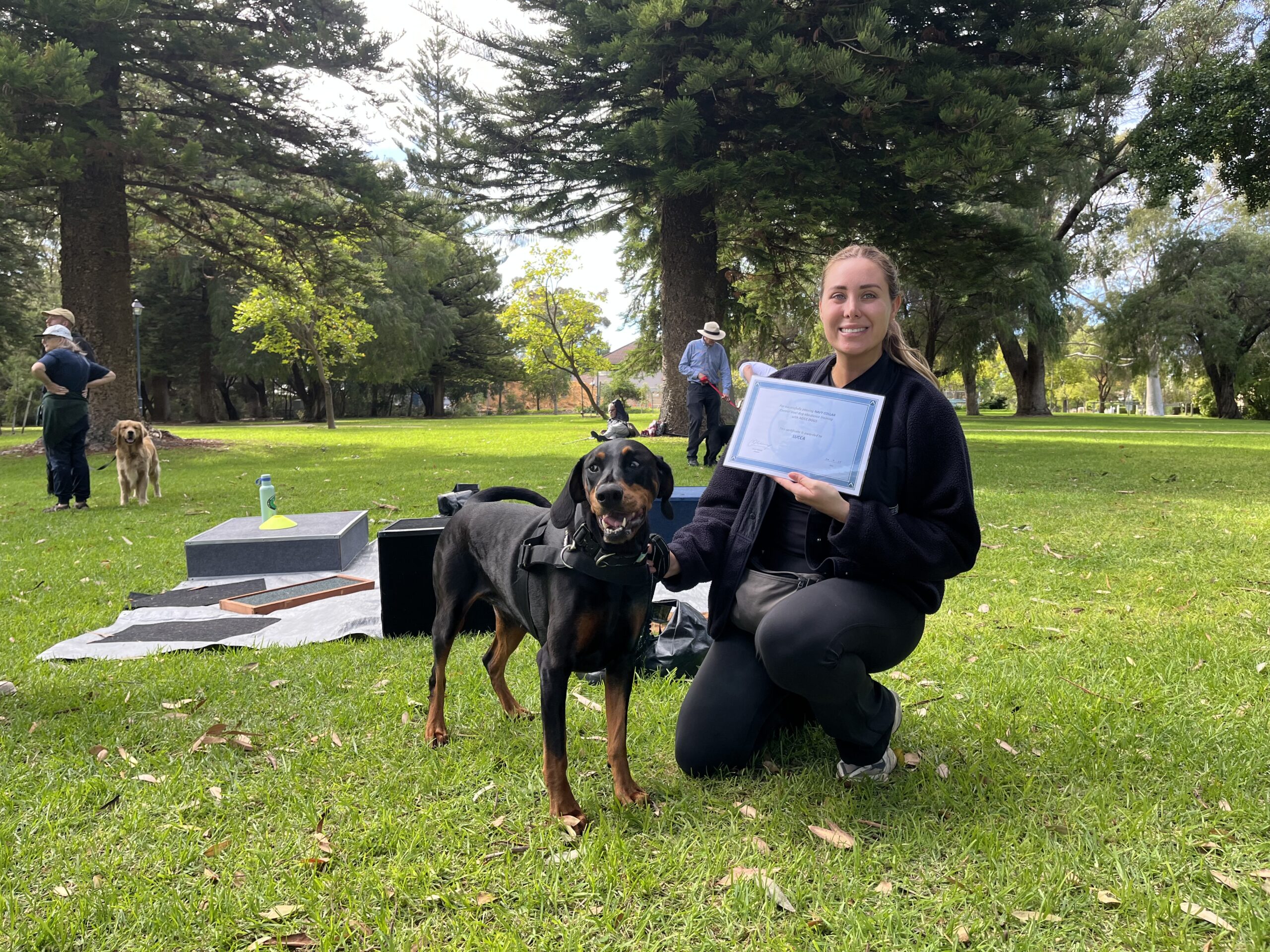 A man kneeling with a certificate and a happy dog on a leash in a lush park, showcasing professional dog training services by Agile Dogs.